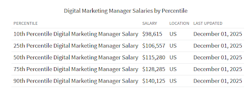 According to Salary.com data for Digital Marketing Manager roles, compensation is driven far more by role impact than by how someone entered the field. In fact, the data shows something surprising: